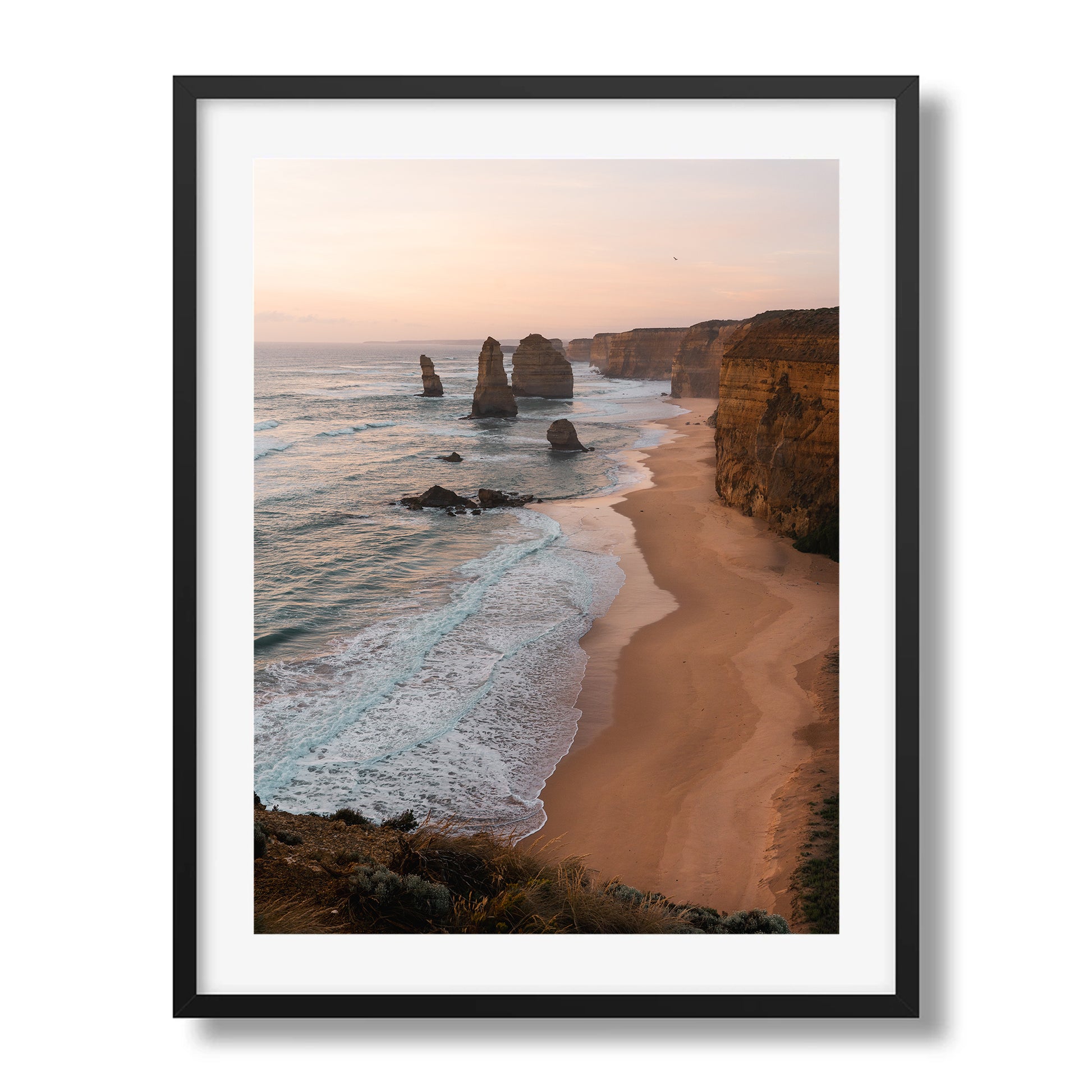 A captivating artwork of the 12 Apostles at golden hour, where the sunset illuminates these iconic limestone stacks, shaped by millions of years of natural forces.