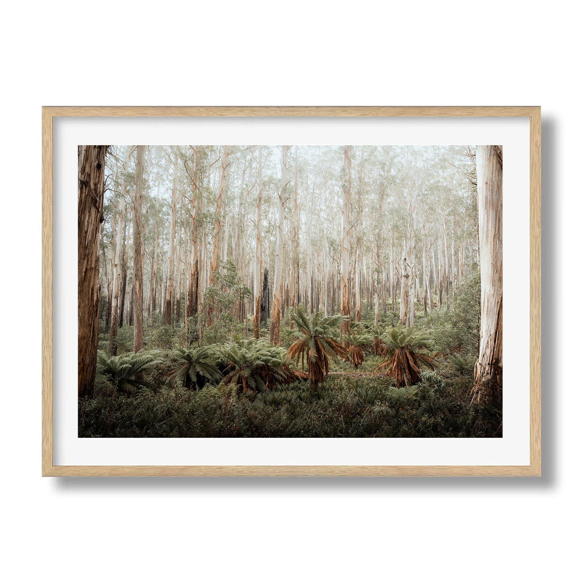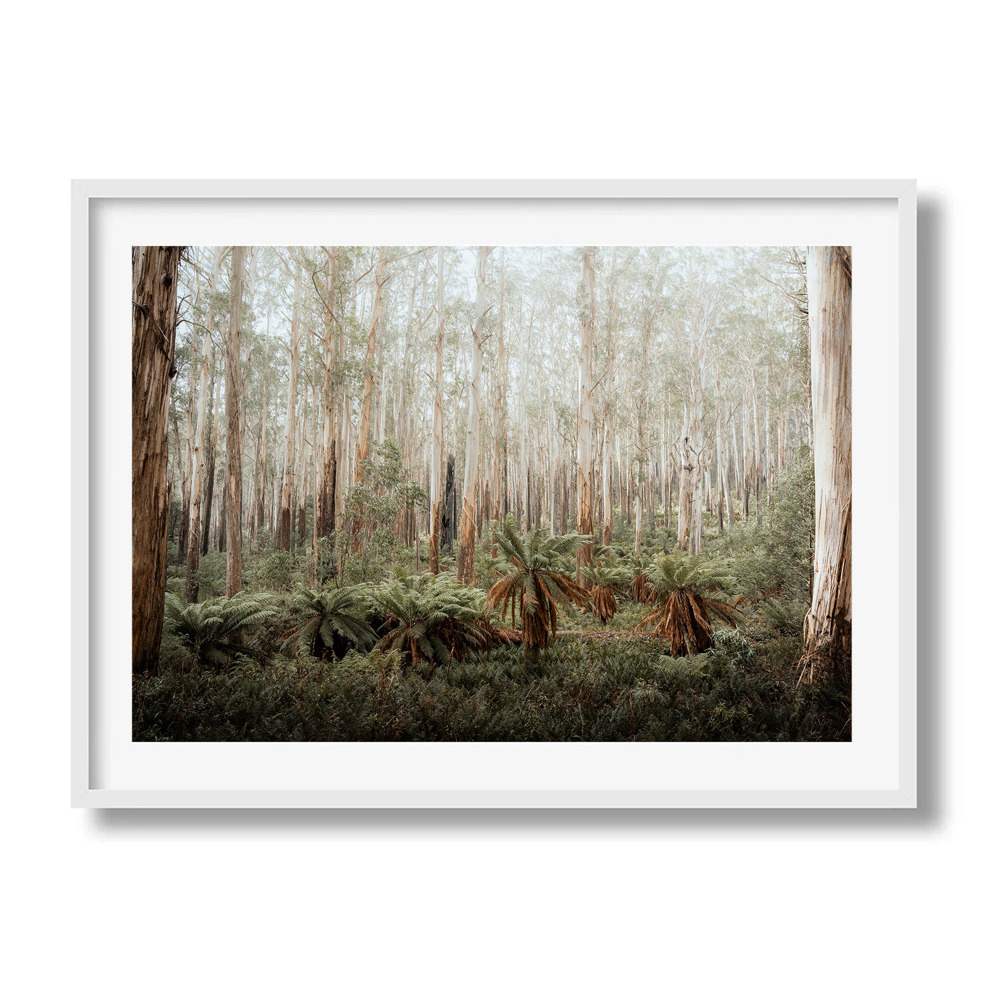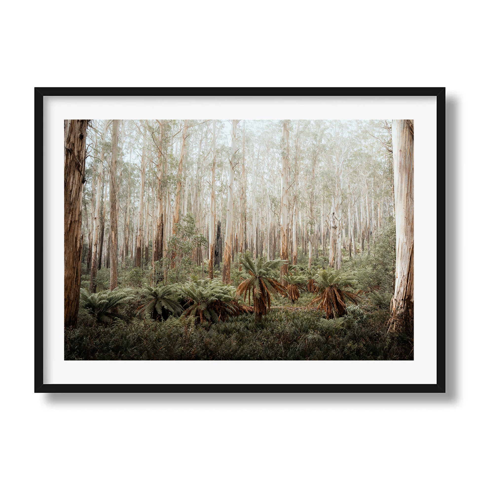 A tranquil, immersive landscape where towering trees rise above a lush, fern-filled undergrowth. This serene forest scene captures the quiet beauty of nature, inviting you to pause and experience the peaceful harmony of the wild."