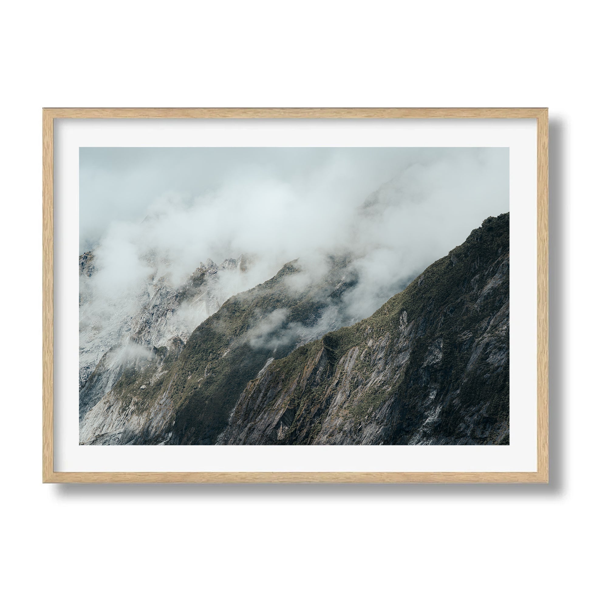 A dramatic view of the Southern Alps near Fox Glacier, featuring rugged peaks and clouds drifting through the mountains, adding depth and atmosphere to the landscape.