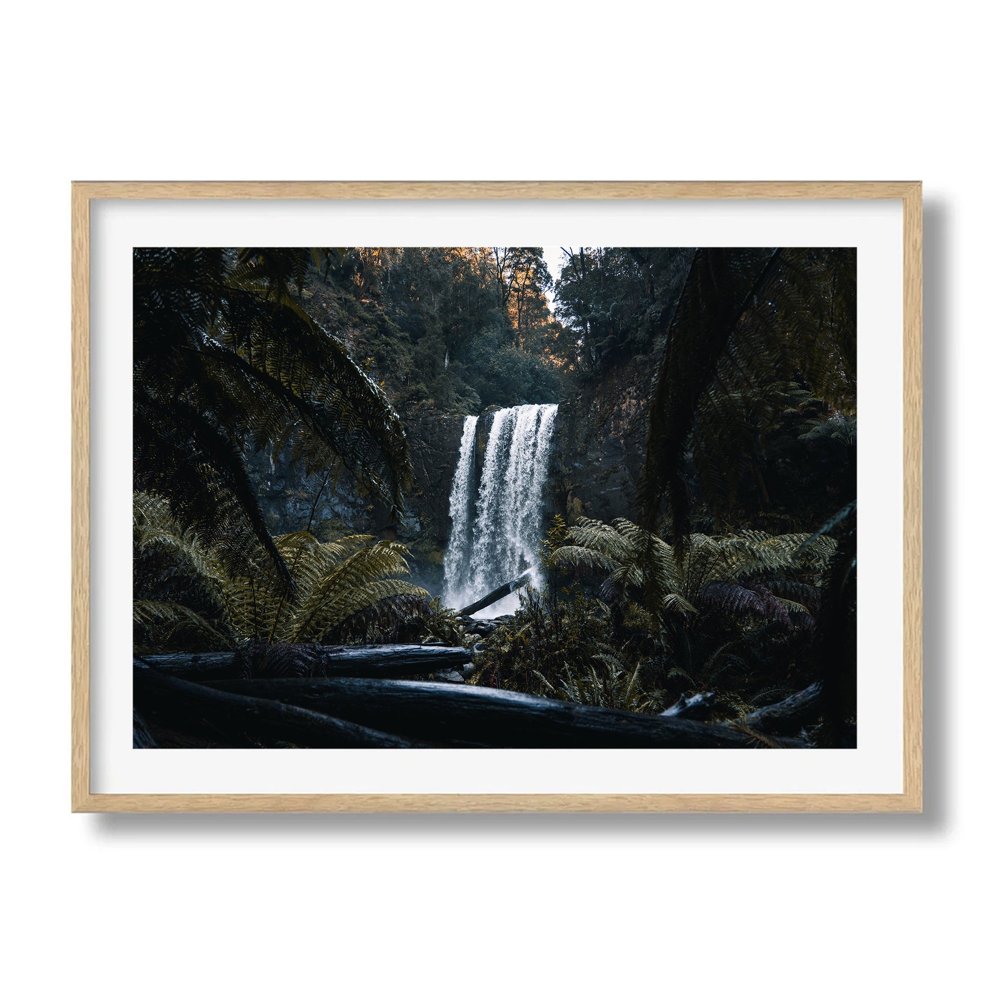 A breathtaking landscape of Hopetoun Falls, where the cascading waterfall flows through vibrant green ferns, set within the tranquil Beach Forest of the Otway Ranges.