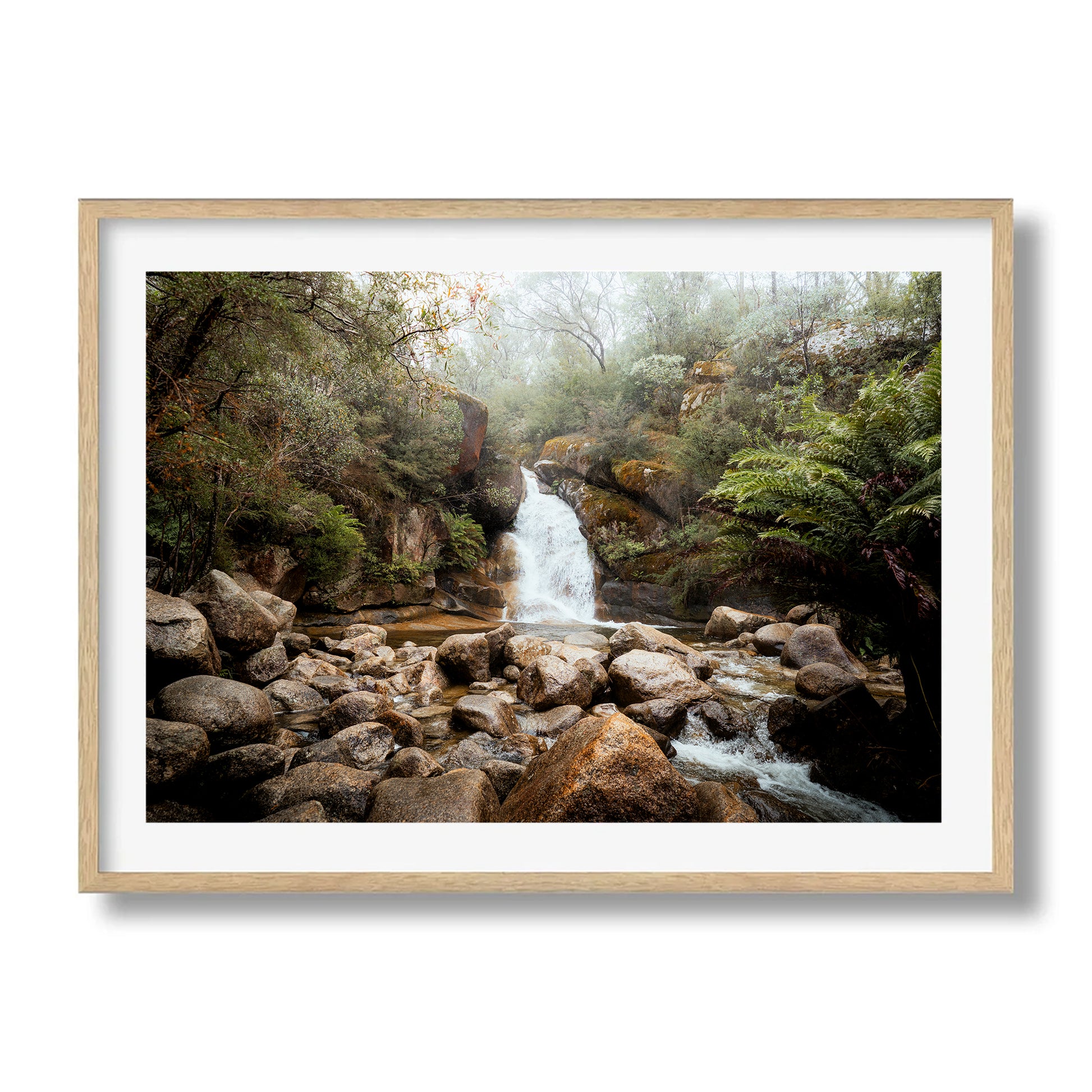A gentle, cascading waterfall flowing over smooth rocks, surrounded by the peaceful forest of Mt Buffalo.