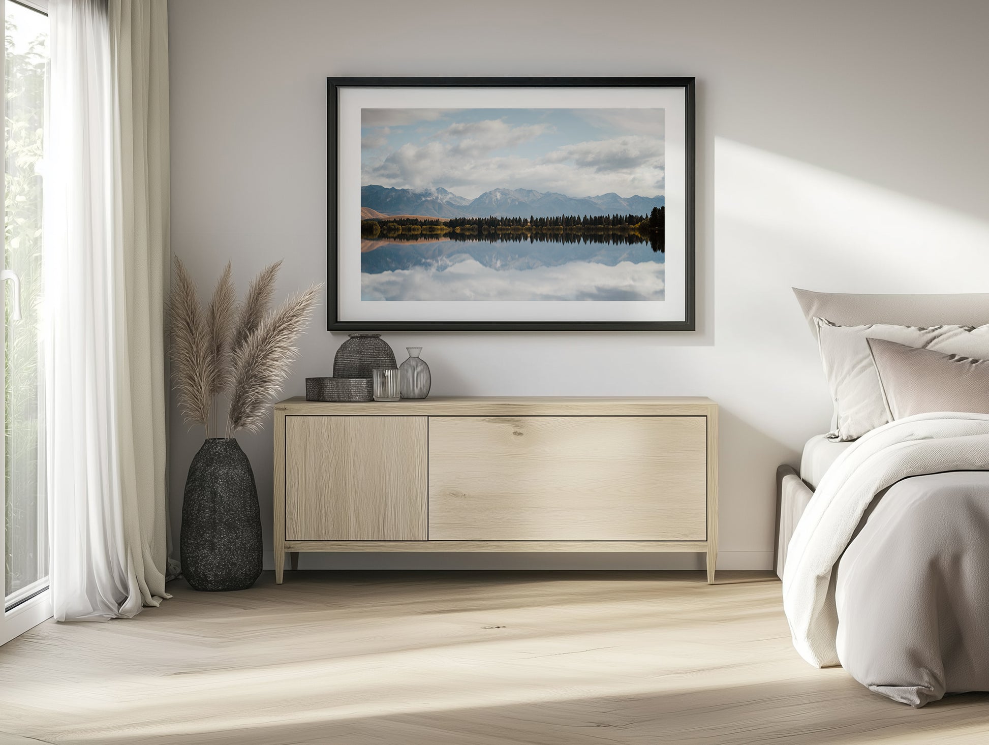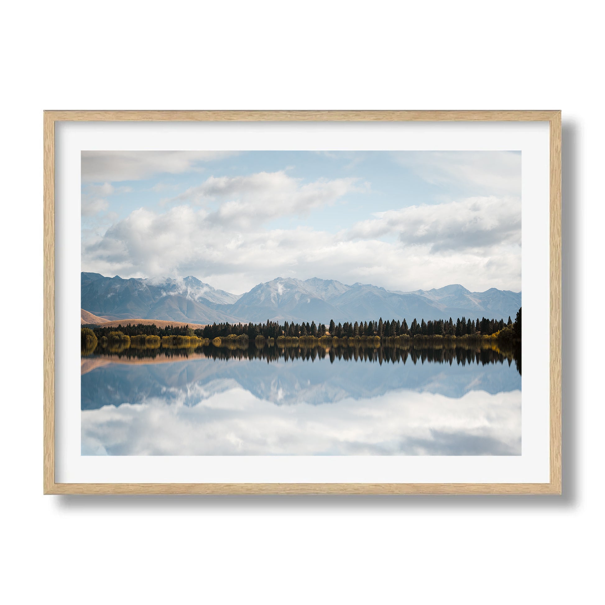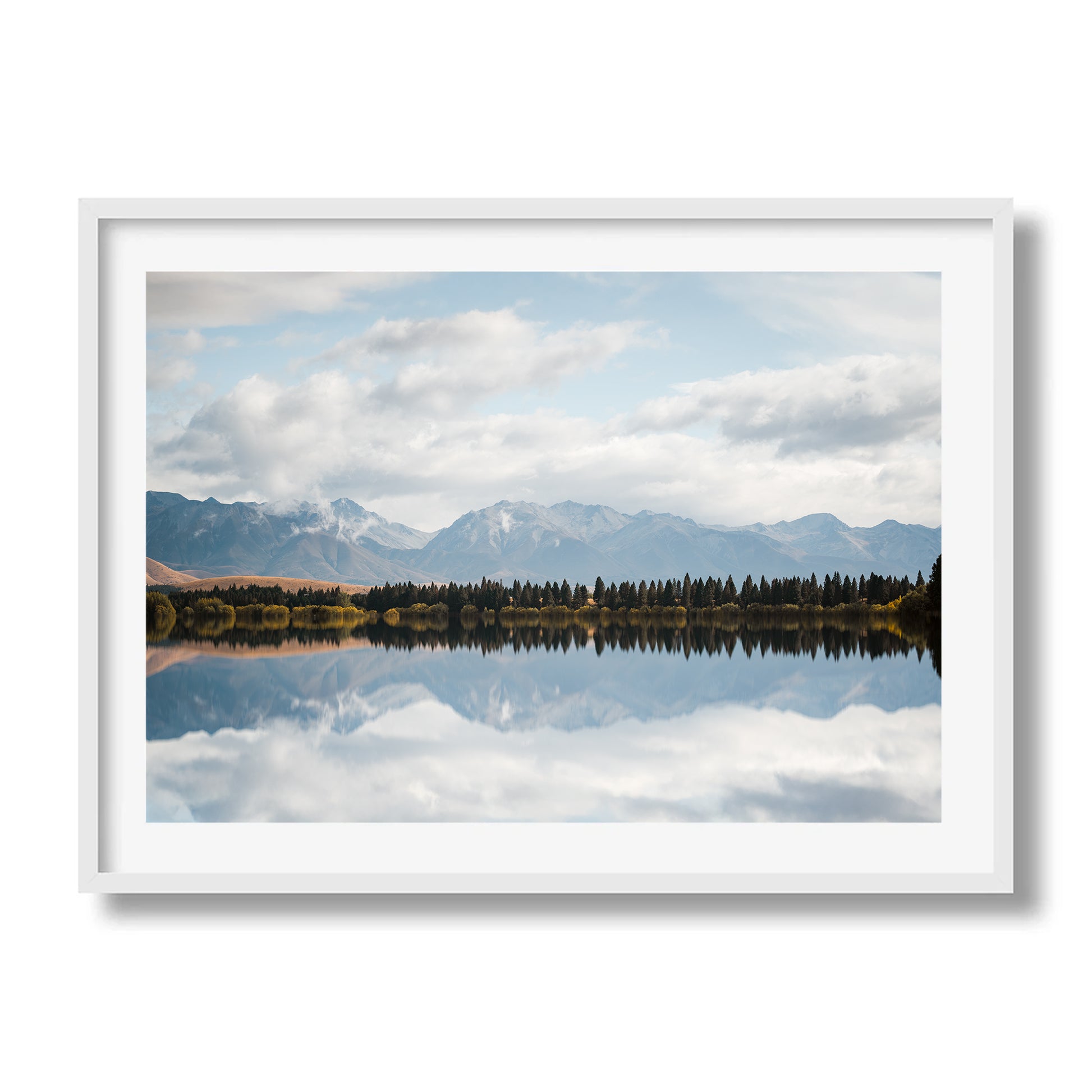 A serene alpine scene where still waters mirror pine trees and distant snow-capped peaks. A peaceful moment from New Zealand’s high country, captured in perfect balance.