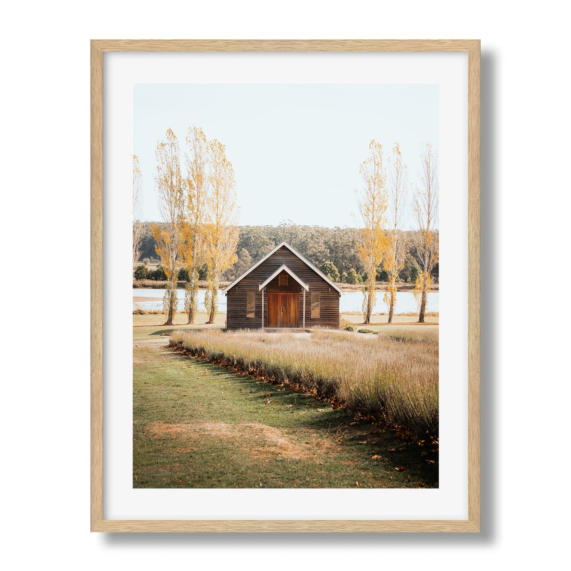 A quiet lakeside scene featuring a rustic timber house framed by golden poplars. Captured in the cooler months, this artwork evokes calm, simplicity, and the beauty of solitude.