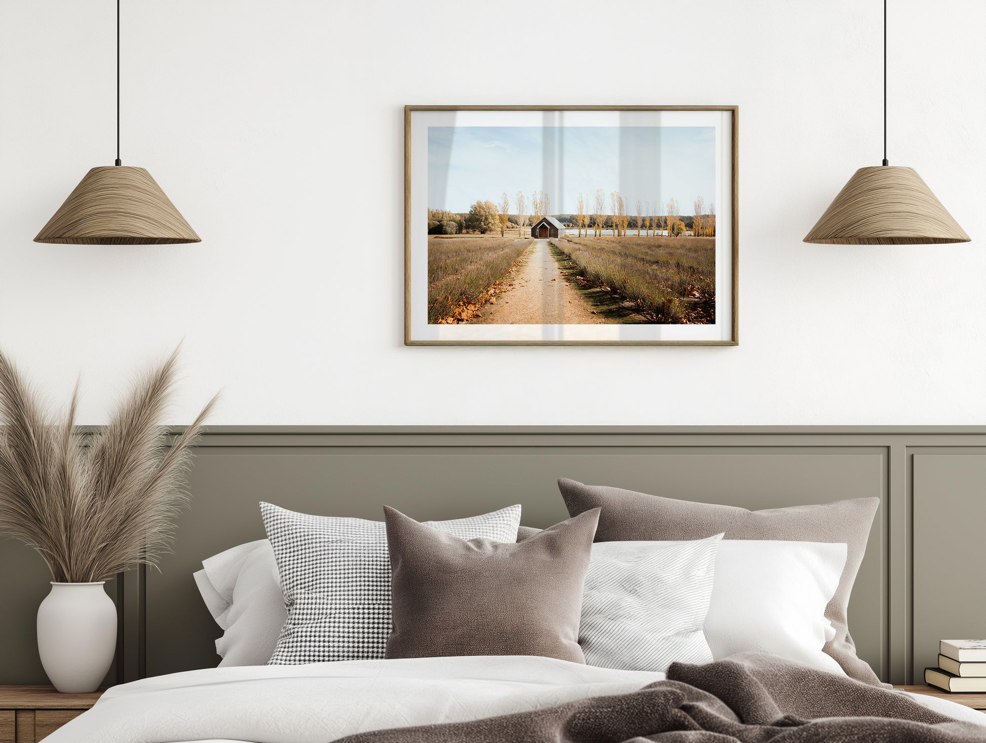 A serene path leads through rows of lavender toward a quaint timber house, framed by golden poplars under a soft blue sky. This peaceful autumn landscape captures the charm of the countryside and invites a sense of calm.