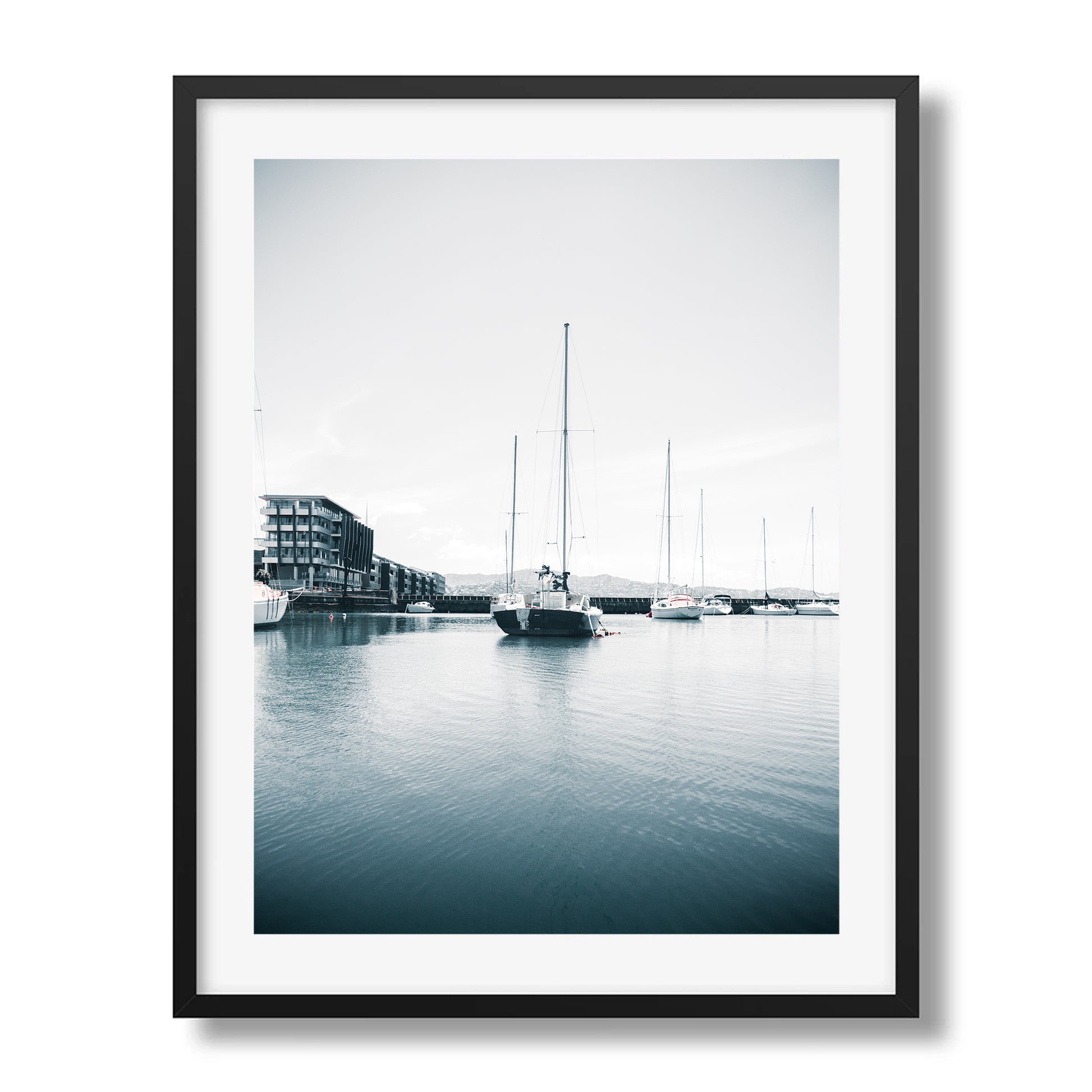 A few boats rest quietly near the Wellington dock in New Zealand, surrounded by still waters and a heavy, overcast sky, capturing the peacefulness of the moment.